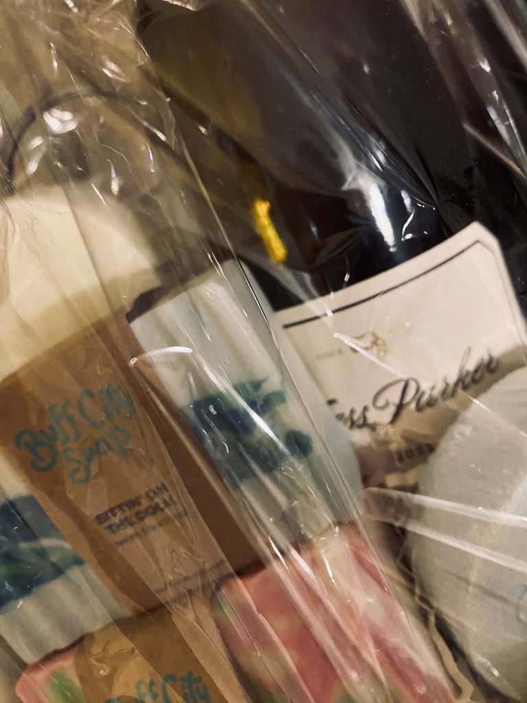 Relax with this spa basket from Buff City Soap basket, 3 shower steamers, 2 soaps and bottle of wine (Chardonnay)