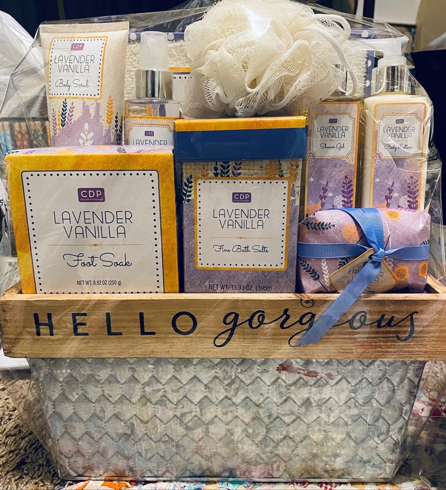 Lavender vanilla spa basket includes metal and wood basket "hello gorgeous" foot soak, soap, body lotion, shower gel, body scrub, spray, bath salts, bath pouf and hand towel