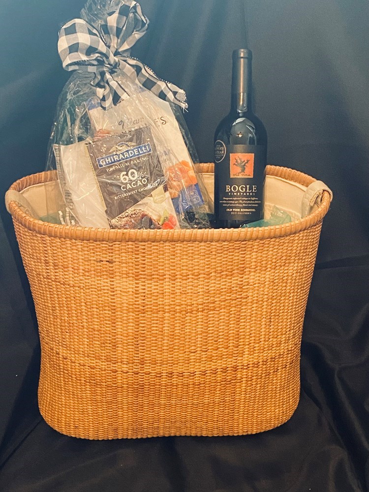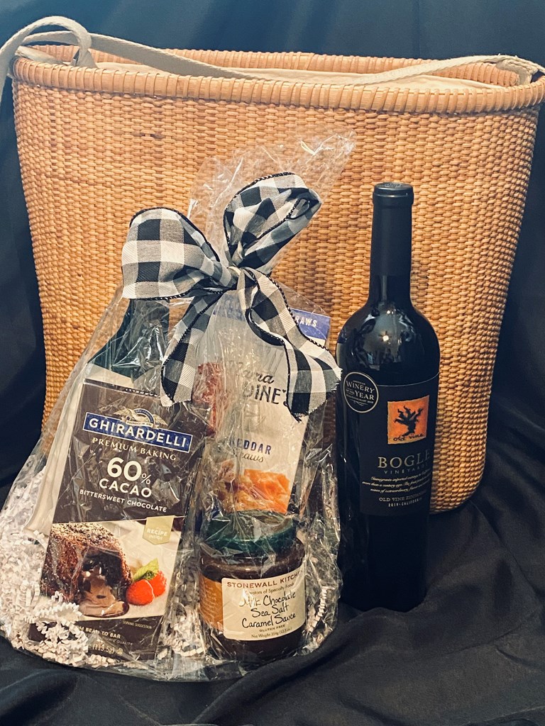 Harvest of Barnstable picnic basket 15x 15 x8, food items (cheese straws, chocolate, Milk chocolate sea salt caramel sauce, spicy dry salami, pretzels )and wine ( Bogle old Vine Zinfandel)