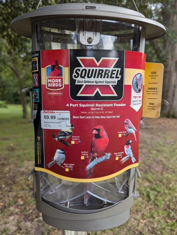 4 Port Squirrel resistant bird feeder! It holds up to 3 quarts/4 lb of bird seed and has a metal roof that locks to help keep those adorable squirrels out!