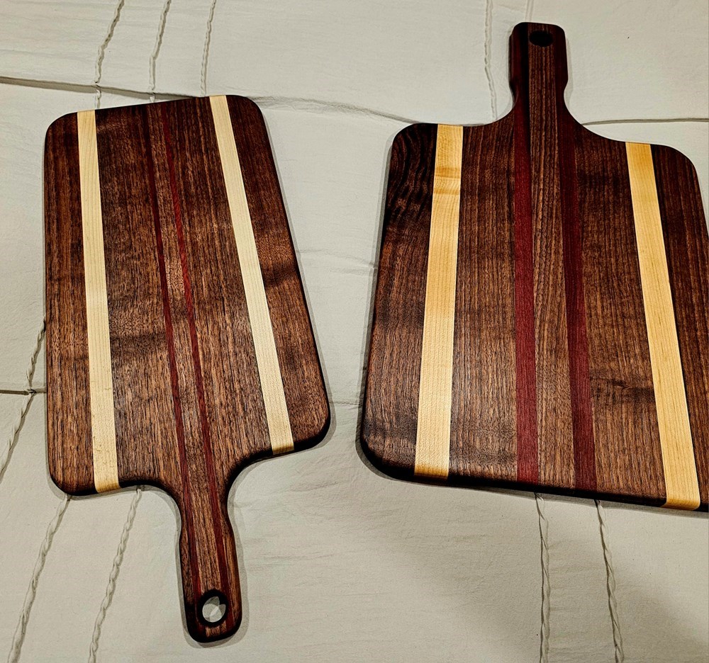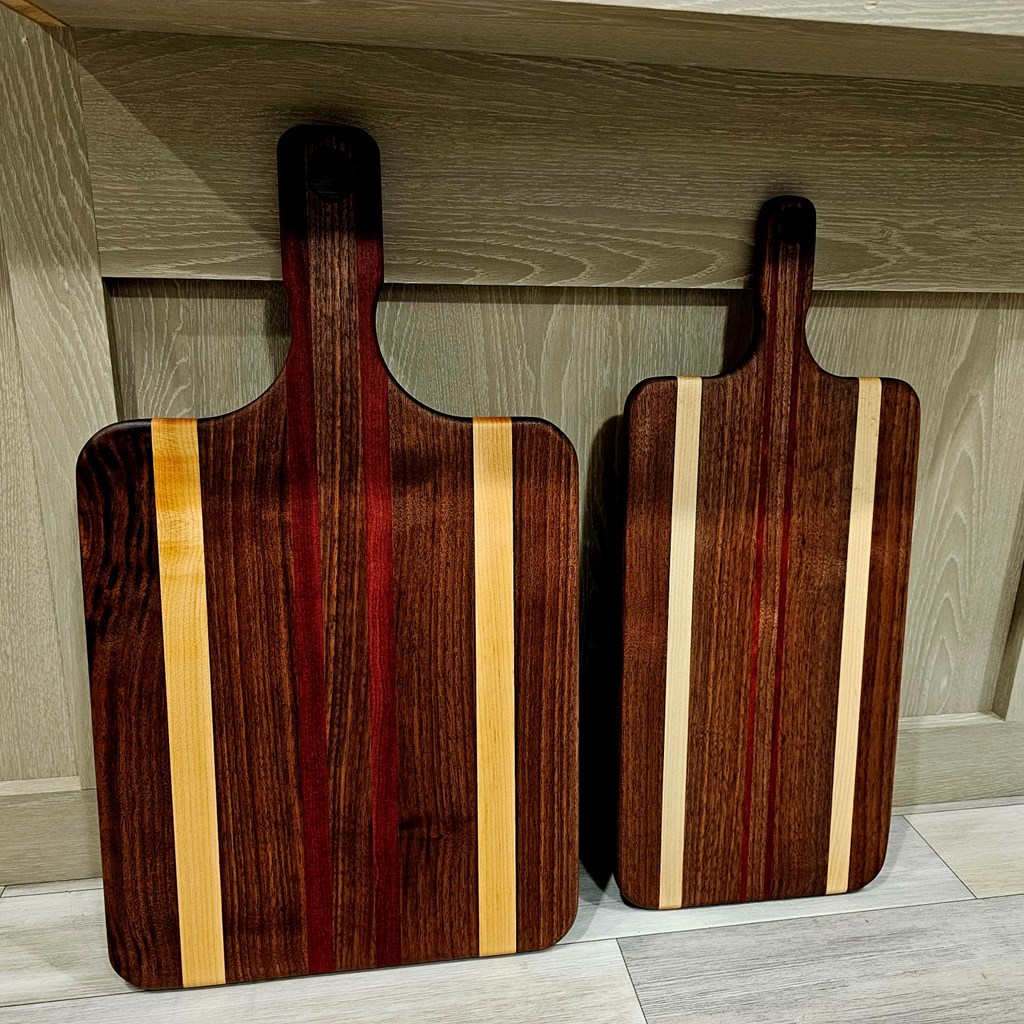 Matching cutting and charcuterie boards. Handmade by local artist Johnny McKenzie Made out of black walnut, hard maple, and bloodwood. Cutting board is approximately 14" x 12" x 3/4" thick. Charcuterie board is 15" x 8-1/2" x 1/2" thick. Measurements do not include handles.