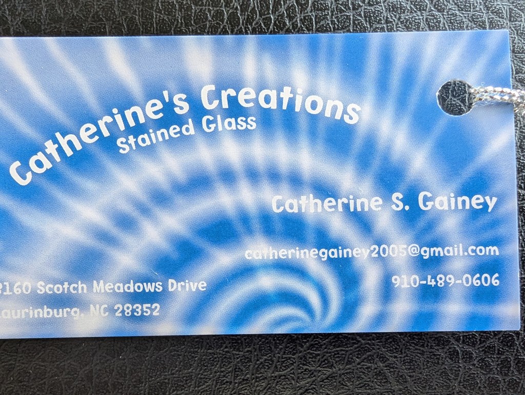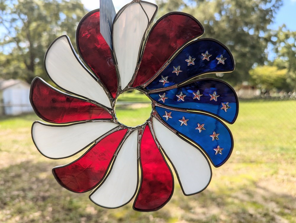 Beautiful red, white, and blue stained glass art. It measures 8.5 inches across and 8.5 inches in height. It comes with an 8-inch chain attached for easy hanging in your window. Made by local artist Catherine Gainey with Catherine's Creations.
