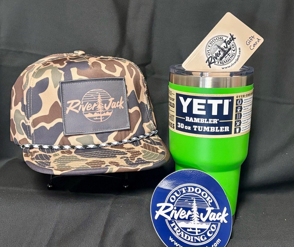 Cool and practical items from RiverJack store located in downtown Southern Pines. 1) Lime-green Yeti tumbler 2) RiverJack camo hat 3) $25 gift card 4) RiverJack decal