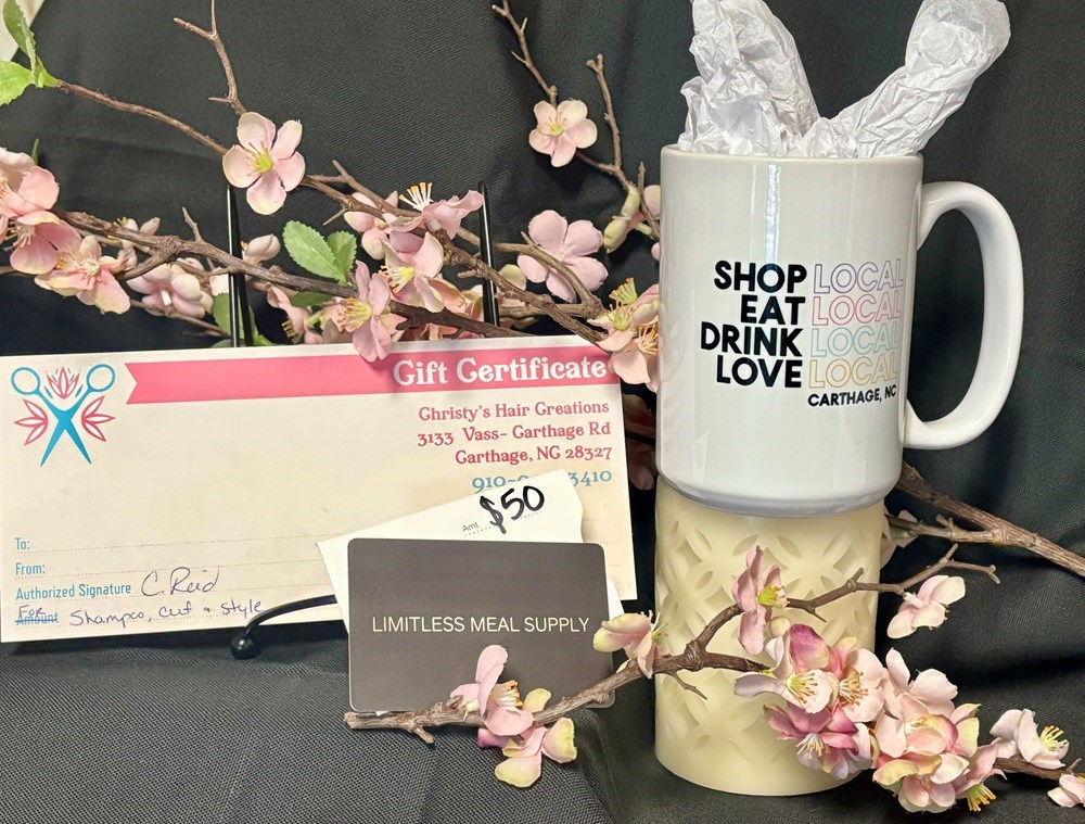 Collection of Carthage Goodies! Donated from merchants in Carthage, NC. 1) $50 gift card to Limitless Meal Supply 2) Colorful Carthage coffee mug 3) $45 gift certificate to Christy’s Hair Creations in Carthage