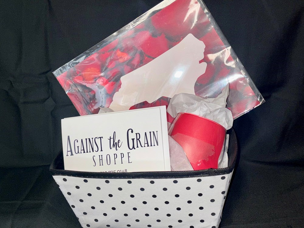 Artisan gifts from Against The Grain. 1) 2 wine glasses with the NC state emblem etched in. Bonus - Made in Moore County! 2) A $10 gift card 3) Vibrant red alcohol ink with NC state emblem - perfect for framing!