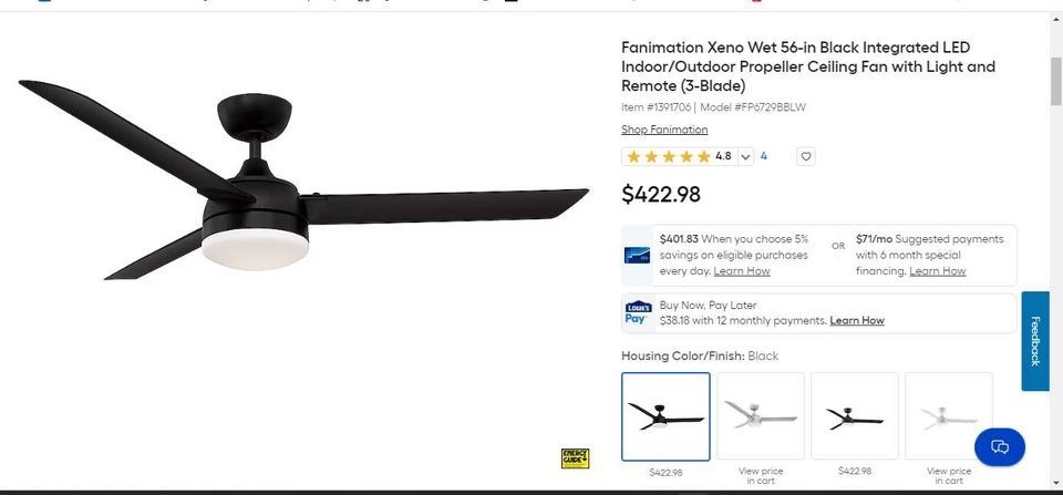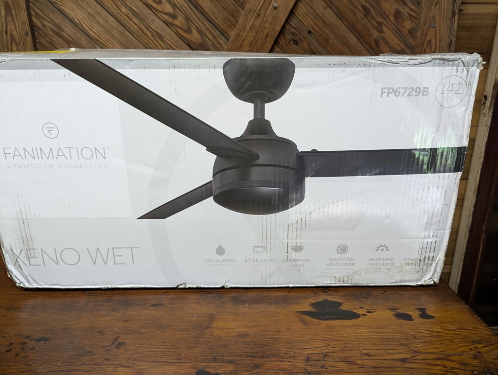 Brand new, 56-inch Fanimation 3-blade, indoor/outdoor ceiling fan with remote control. Selling at Lowes for $422.
